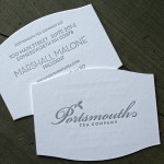 An identity system need not have enough colors to choke a horse. Letterpress printing makes the understated shine. This system for Portsmouth Tea Company is magnificently elegant and simple. Just a single color - metallic silver. And premium materials - Crane 100% cotton paper. Notice the custom converted policy style envelope incorporating the shape into the flap. 179lb Crane Cover cardstock for the business cards.