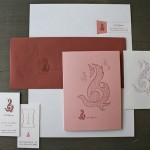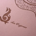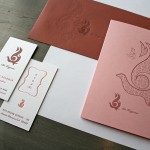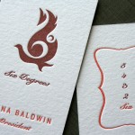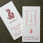 This system designed over at Space150 by Jason Strong brings color to the system by adding a couple contrasting papers. We printed the same letterpress ink color on the white stock and then the burgundy colored stock for the envelopes. This creates a tone-on-tone effect that remains legible and adds a nice texture. A smaller note card in a pink stock also matches the pink ink used throughout the pieces. The business cards are on thick 220lb Crane Lettra, which does an excellent job eliminating the impression show through of a two sided card.