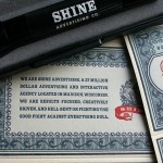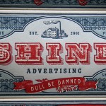 Shine Advertising Co. in Madison, WI designed this flashlight box wrapper as a promotional piece for their agency. The look is a pretty sweet 1800’s ephemera inspired style and inside is a mini Maglite flashlight. We letterpress printed in four spot colors on Smart Genisis Husk 110lb C - 100% PCW. There are three tones of blue ink plus red ink.