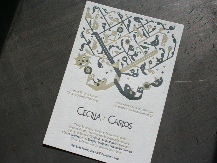This illustrated wedding invitation was influenced by the ultra baroque style of the church location for the marriage ceremony. Federico Jordan designed and illustrated in his unique graphic style. The event will be in the colonial city of San Luis Potosí. The Templo del Carmen was build in 1741 and looks amazing. Inside there is a small chapel know as Capilla de Nuestra señora del Carmen where the brides ancestors are buried.