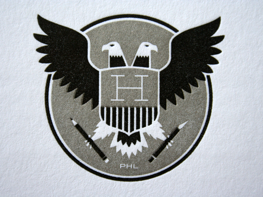 For some illustration inspiration and silk screen goodness check out the Heads of State from Philadelphia. They designed these business cards with an insignia that turns the national USA seal on its ear, adding an extra head and replacing the olive branch and arrows with a pencil and x-acto knife. We letterpress printed in black and dark silver on both sides of Crane Lettra 220lb FLo White and edge colored to match the silver - it’s a card thick enough to plant a listening device inside. And maybe we did that too… maybe.