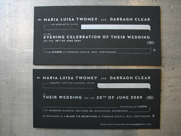 Setting the tone for a black tie event with rich black paper just seems logical. Black paper should actually be a requirement if you are having a reception in a castle. (insert jealous sigh here) This contemporary type and linear design is letterpress printed with silver ink on 250gsm Stonehenge Black Paper in a horizontal format. It’s nice to see the type arranged outside typical wedding layouts. These invites were designed by a fantastic design firm - Field - based out of Copenhagen and Dublin. Which goes to show we are happy to letterpress print custom work for designers everywhere.