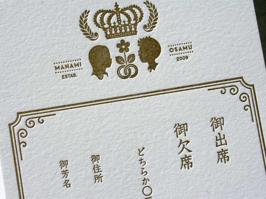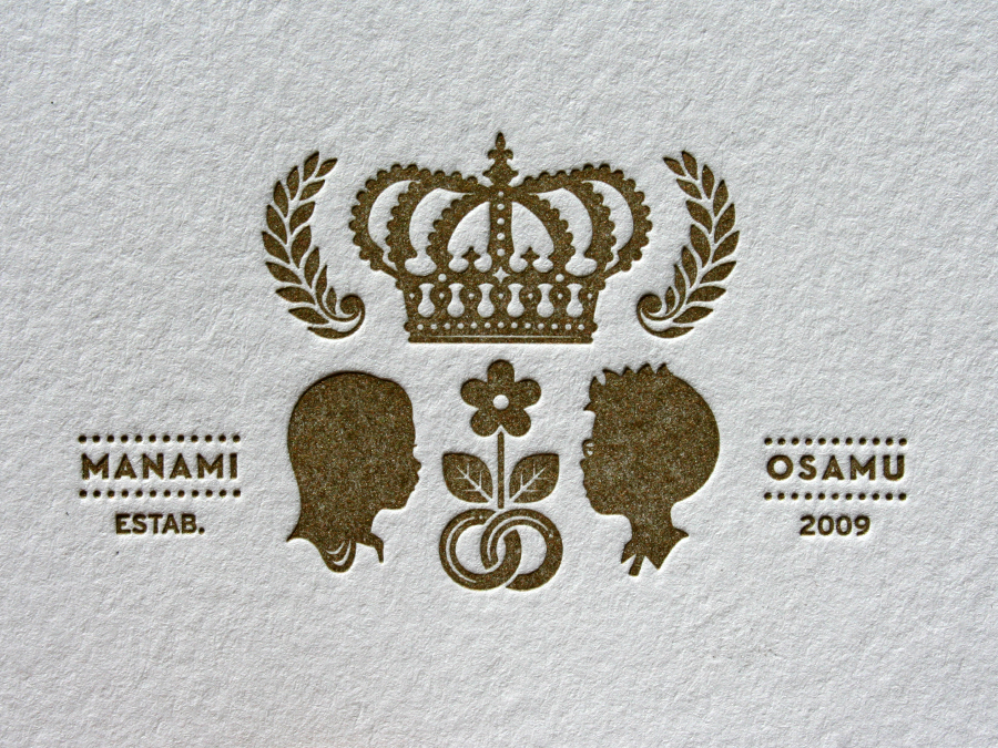 This simple one color wedding invitation was designed by the groom for the couples December wedding in Kyoto, Japan. The head silhouettes have a unique anime / manga style. We also love the modern graphic crest containing the interlocking rings and the matrimony announcement. It’s a bold yet refined design - traditional subject with a modern presentation. Nice work Osamu!