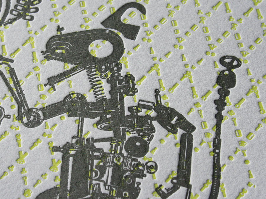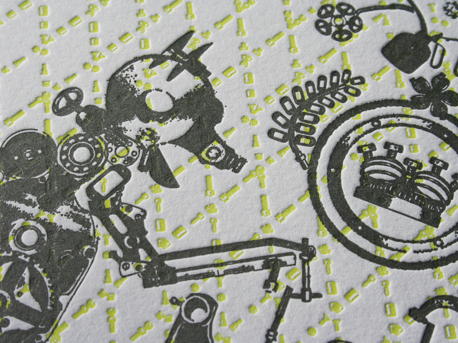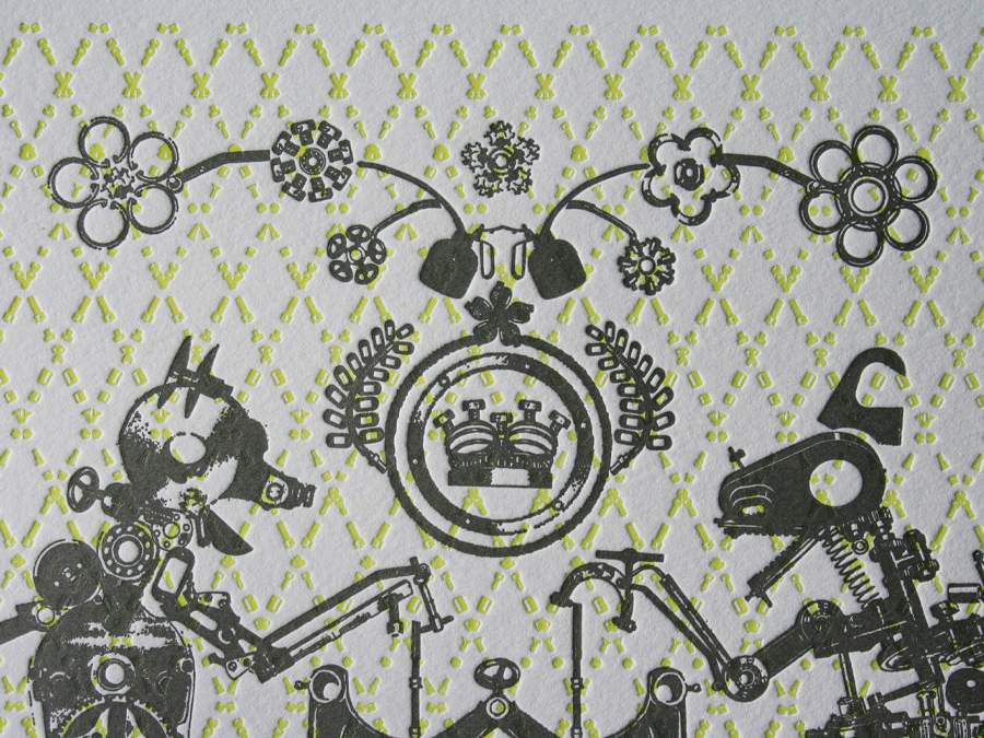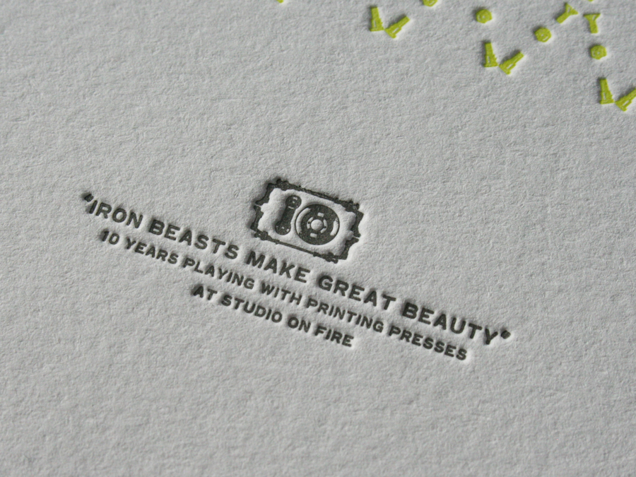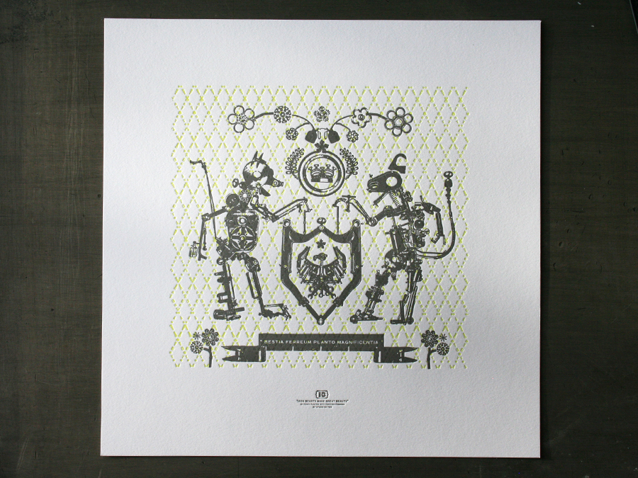 These beasts are in fact our toys. The graphic beasts are constructed from various press parts and form into a crest that commemorates ten years of printing here at Studio On Fire. The dog latin phrase reads “Iron Beasts Make Great Beauty”. It is printed in fluorescent and dark silver inks on Crane Lettra Flo White 220lbC at 13 x 13 size.