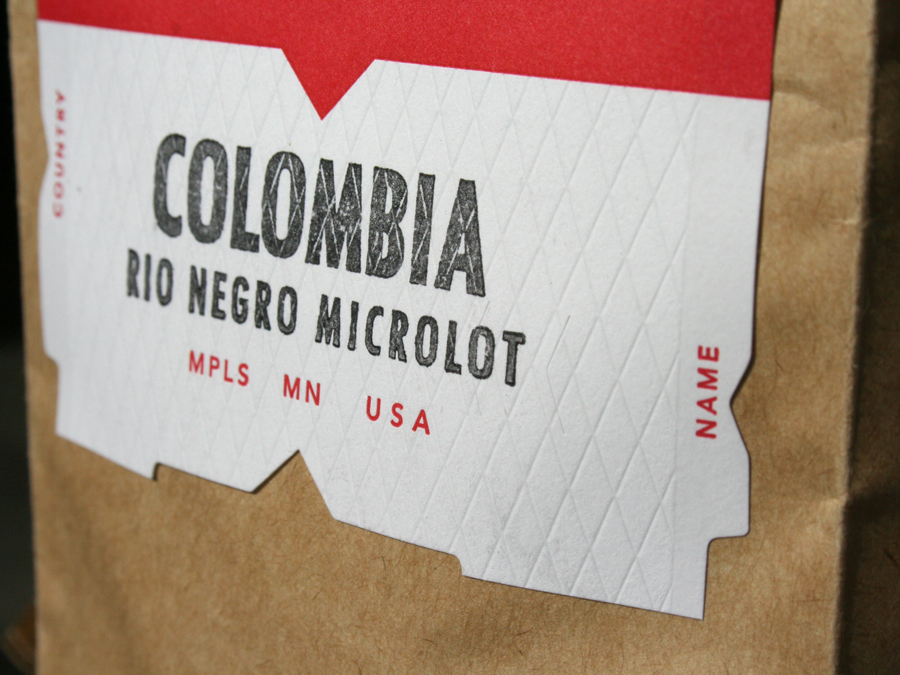 We printed these with two colors - a red and a very light gray /nearly blind ink for the diamond texture. They are printed on our house label stock which is Strathmore Writing, Ultimate White Wove. This label takes a stiff impression and has a bit of tooth and texture that adds to the artisanal quality of letterpress. They are kisscut two up on an 8.5 x 11 sheet. They are cleverly designed to be end user friendly with use of simple rubber stamp imprints specific to the roasted microlots. Overprinting the stamp on the letterpress imprint gives the surface another layer of texture.