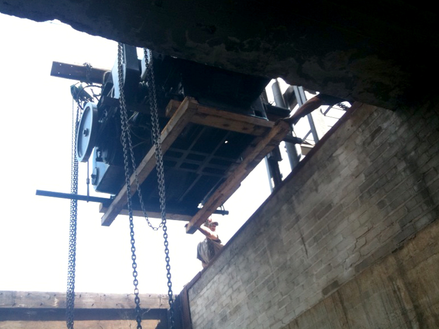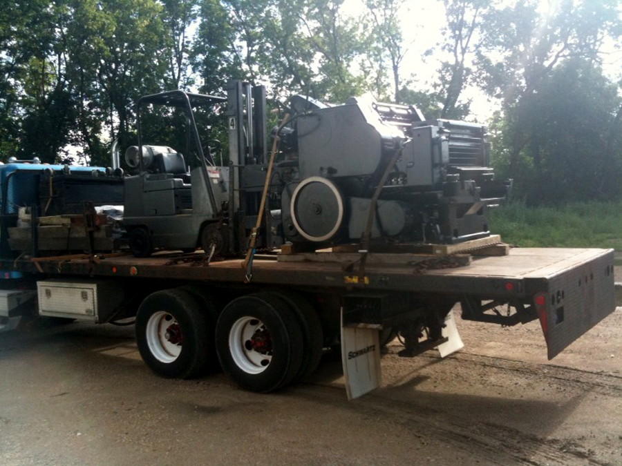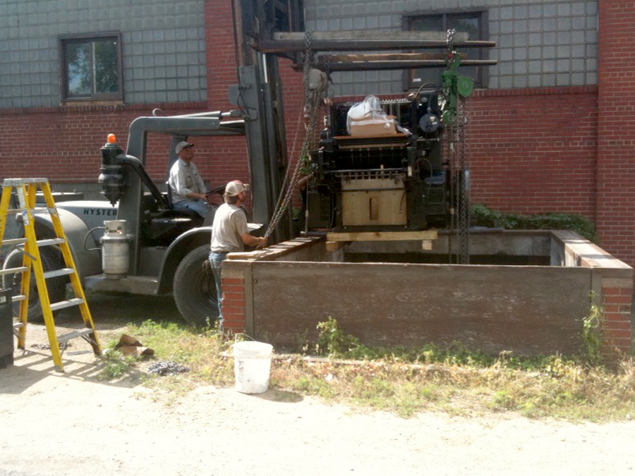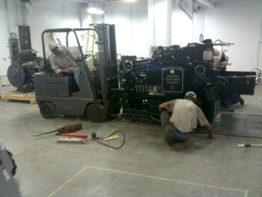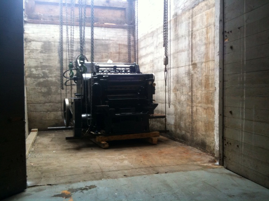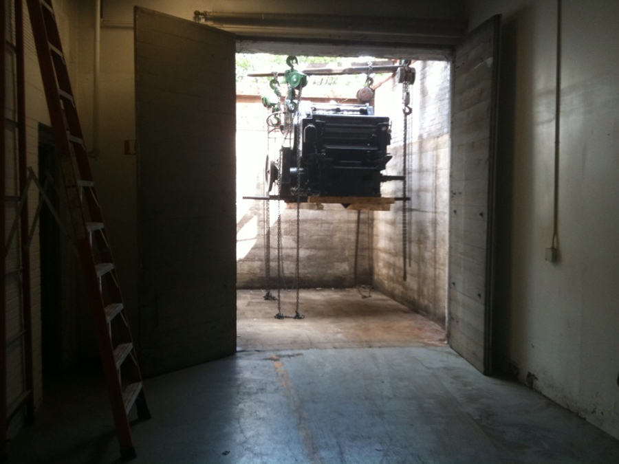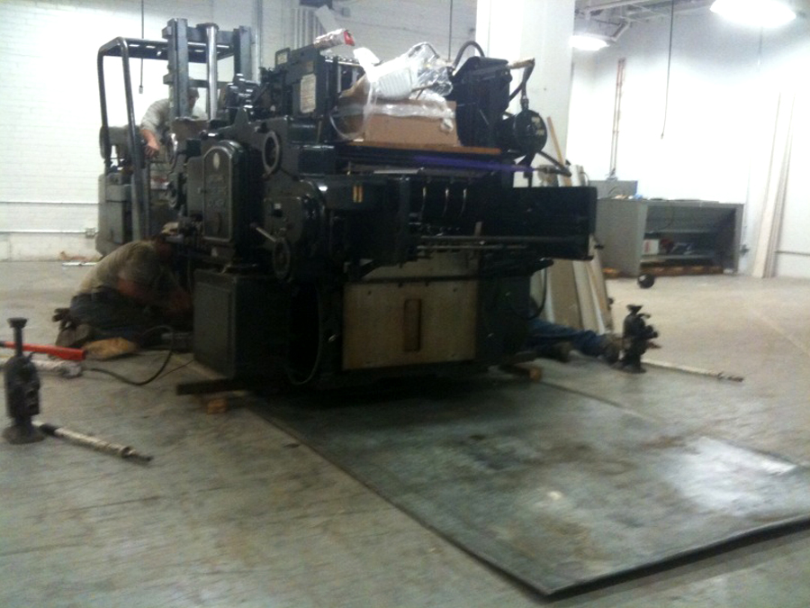 Here’s how our press room is taking shape and some pics of the epic Heidelberg S Cylinder press installation. It was a little unnerving watching our “new” machine suspended mid air. The riggers used a big outdoor forklift to position the press and then four chain drops to lower it from the forks down a large hatch into the basement. It was then rolled into place and suspended again to slip an oil drip pan underneath. It is now glued to the floor and wired in. We are doing print testing to get it up and printing smoothly. This press will allow us to letterpress print LP jackets, pocket folders, and posters up to a 21 x 28 sheet format. We are excited to see what it will print first.