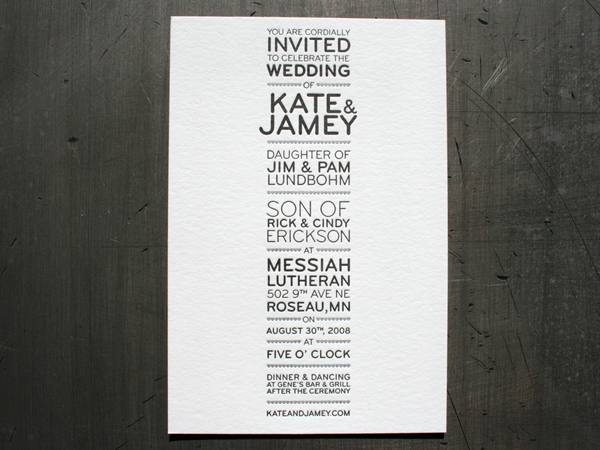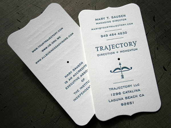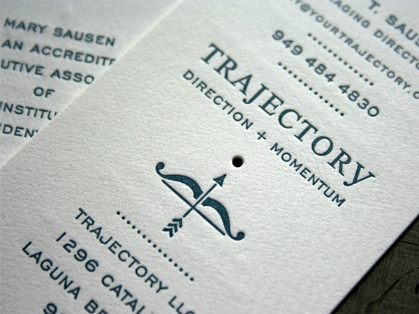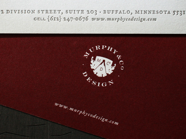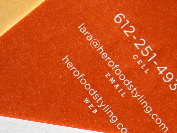 In modern letterpress application, clients want to see impression. As a general rule, reversing small type out of a larger graphic is not the best use of letterpress. The type is not getting “impressed” - the graphic around the type is. So, if you are looking for letterpress impression with your text, don’t reverse out of a field of color. Note how the small information text and the logo on the black side of the card have more visible impression than the logo inside the spatter mark.