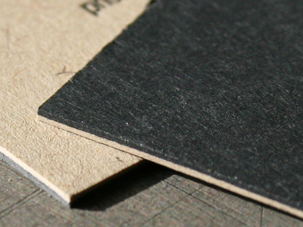 This card is printed on a custom duplexed paper - French Construction Black glued to French Speckletone. On the black side we printed a red metallic ink. Metallic ink colors on in letterpress or offset printing are opaque BUT as color pigment such as red is added the ink becomes more transparent. The look is more subtle than a foil stamp.