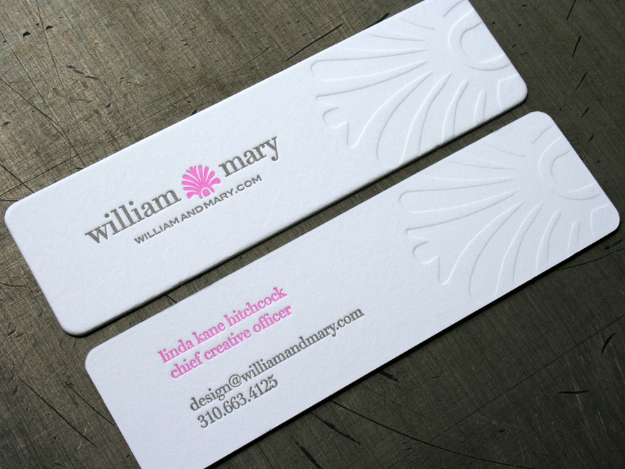 These business cards are elegant and simple with an unusual format. Although the feel of the design is traditional, the 4.25 x 1.25 inch size presents as an untraditional business card size. The client, William and Mary, makes premium gift wrap collections, so the paper crafting of the printing was very important.
