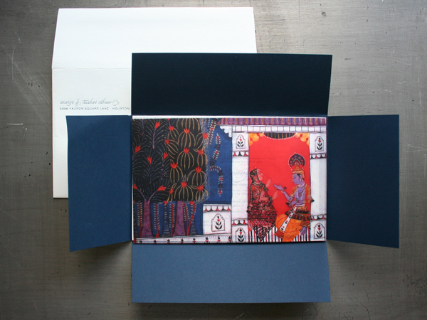 Priya: “The background for the design is that the couple are to be married in a botanical garden and the bride Neerja was really inspired by traditional Indian miniature paintings which often depict figures in natural settings. She wanted to incorporate a painting with her invitation so we printed one on vellum as a cover sheet for the invite.”