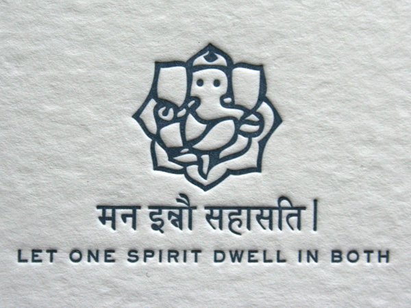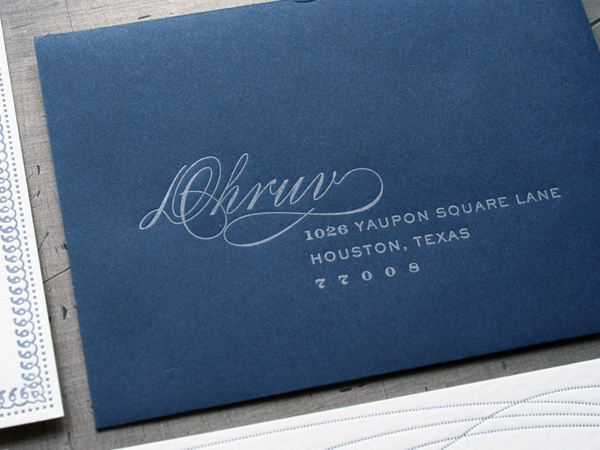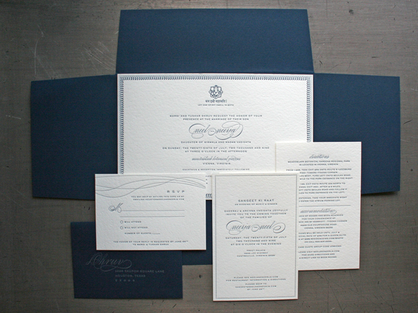 We produced the design from Priya with a combination of letterpress and digital printing. Digital printing is used for the vellum sheet and the back of the reception card. All of the navy text is letterpress printed. The paper stock is 111lb (300gsm) Canaletto Grana Grossa 20% cotton from Gruppo Cordenons. We also die cut the contrasting navy paper for the folding enclosure using French Papers Nightshift Blue and mixed our printing ink to cordinate with the navy paper. The minimal typography and ornamental detail of this design were perfectly suited for letterpress printing and produced a beautiful sculptural impression.