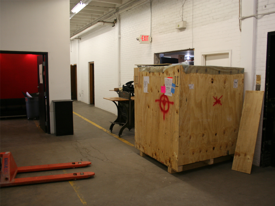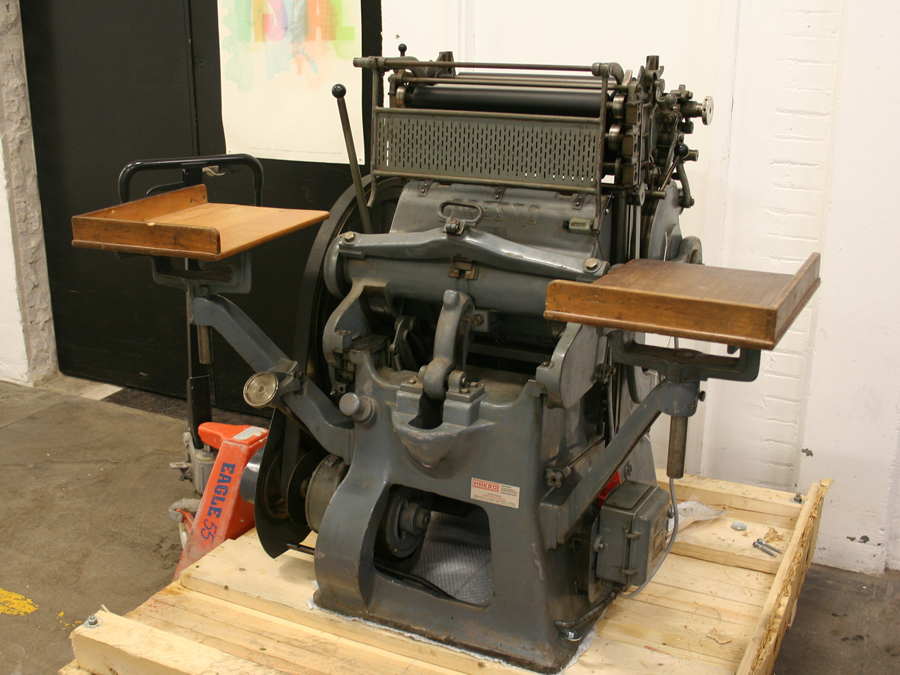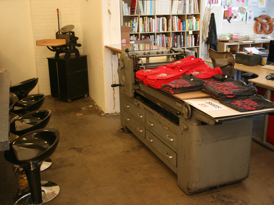 A giant thank you to all the employees, friends and family who helped with our Open Letterpress Studio on Friday last week. Several hundred showed up and helped us crush through hundreds of hot dogs, a couple kegs and a couple liters of Jagermeister. We had a wall of letterpress work up, a couple machines running in the press room, new tee shirts for sale and our “new” press arrived that morning, just in from Germany. Really a good day of letterpress!