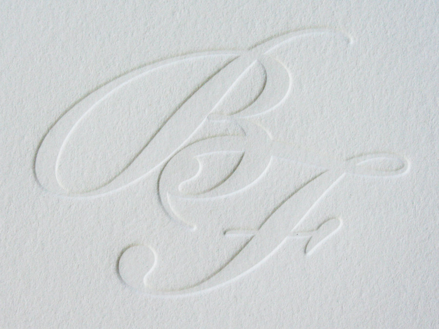 Each stationery element is letterpress printed for the text and with a beautiful blind inkless impression for the logo initials. It utilizes one of the Strathmore sheets we really like for letterpress - 110lb Strathmore Cover Bristol. This sheet has a bit of tooth to the finish and takes a crisp impression. Plus there are matching text weights sheets.