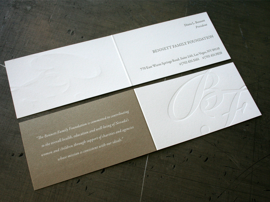 The business cards are scored an fold open to present the contact information. The warm gray flood of color was offset printed (inside of folder, back of letterhead and business cards and insides of envelopes). When we manage production of a business stationery system, usually any offset printing is sent out and completed first. This allows us to properly plan full size press sheets. For instance, this project was able to combine the letterhead and envelope on the same offset sheet. Then we take the sheets back in house and complete the letterpress and finishing. And as this system shows, we do have the capability to letterpress print full size folders with our stationery system production.