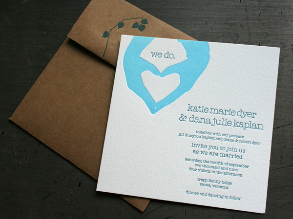 We worked with Vermont couple Dana and Katie to design and letterpress print their wedding invitations. They had a custom silhouette using their own hands to make a heart shape produced by Le Papier Studios. We used this motif throughout the invitation stationery. The soft cotton paper and bright blue silhouettes are contrasted with a simple recycled brown bag envelope and typewriter style navy typography - just the right balance of a raw yet refined style. The invites are printed in a square format with 2 inks on Crane Lettra, 100% cotton stock. All the cards were letterpress printed together on a 13 x 13 press sheet for cost effective production.