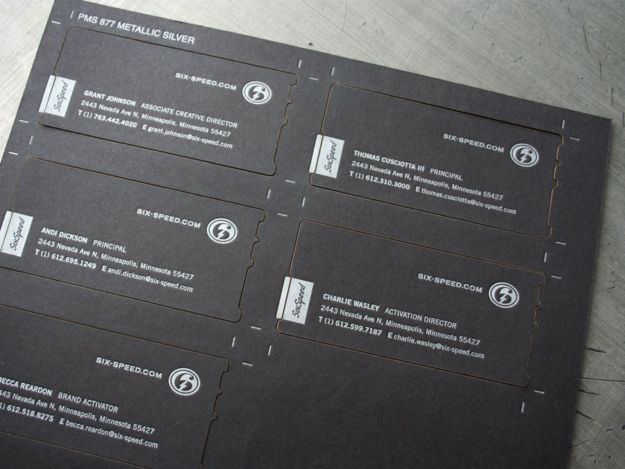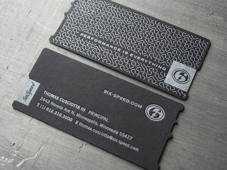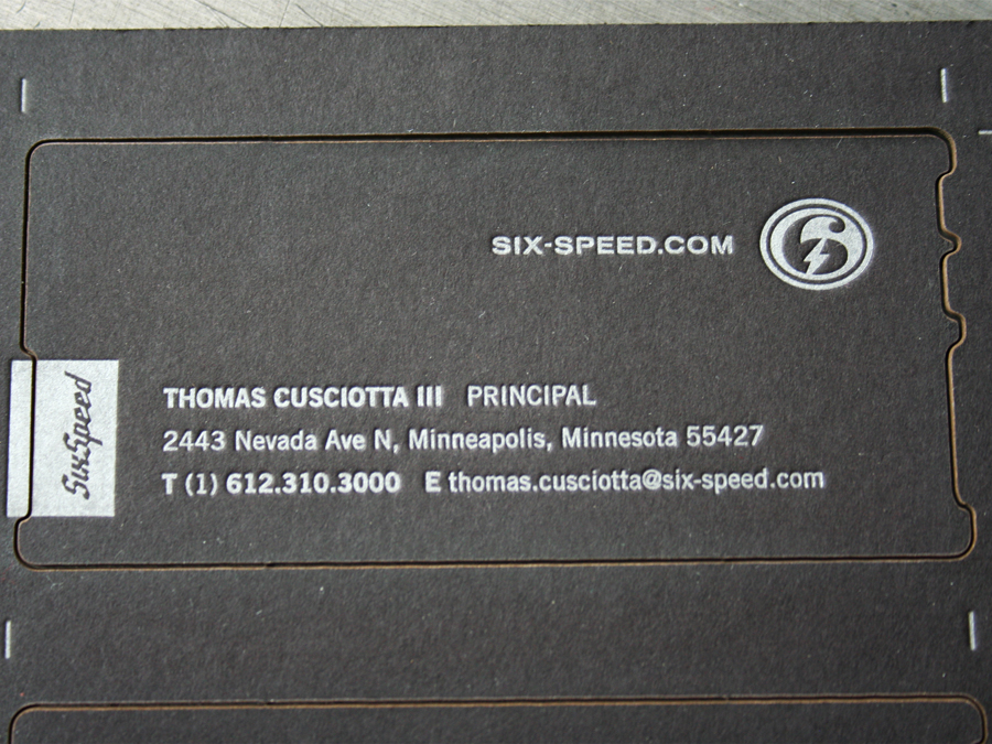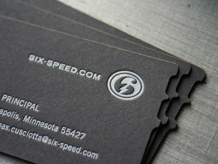 Six Speed sent us this design for custom letterpress business cards. They are a specialized events marketing company here in Minneapolis. And what could be a better business card job really - crushing AND burning all on the same press sheet.