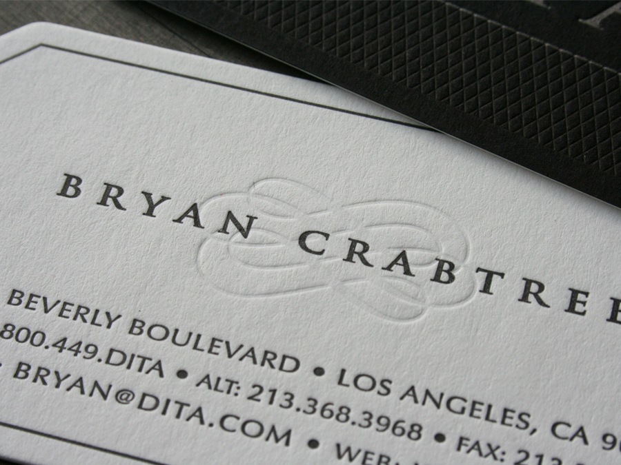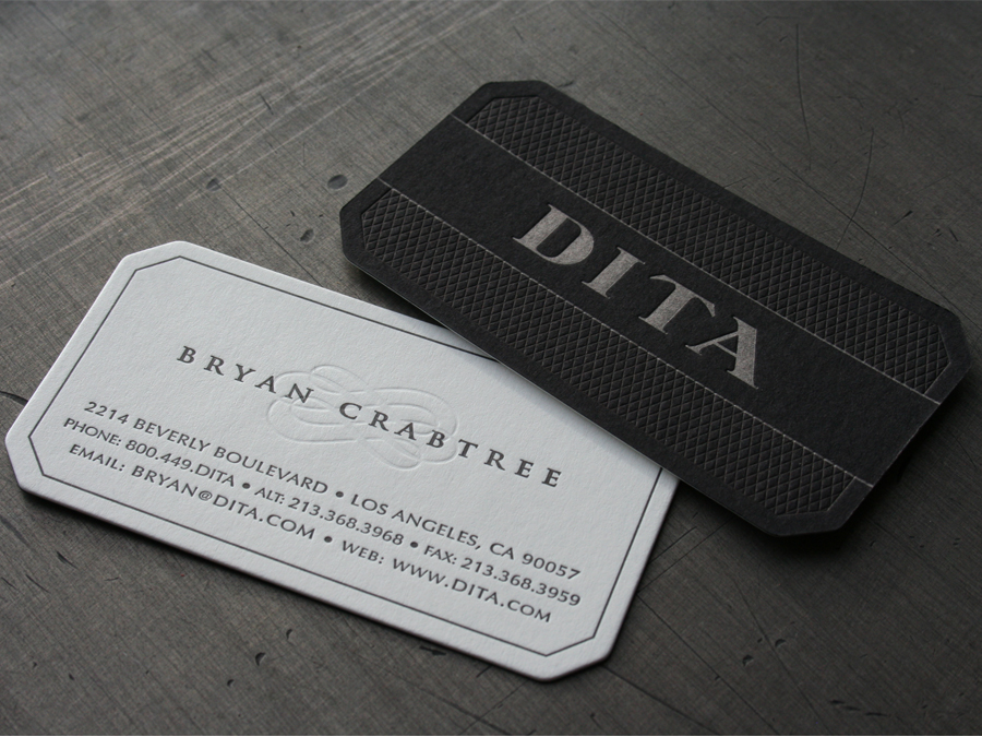 These are the brand new cards for Dita Eyewear in Los Angeles. Bryan Crabtree designed them and did a nice post over on his blog too. The blind flourish on the light side and the diamond pattern on the black gives these cards a tonal and elegant look.