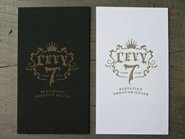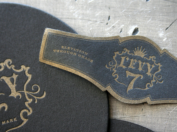 The materials were designed by our friends in DesignWorks at BBDO in New York, a group that bleeds pure design talent. There are business cards, coasters and of course, cigar bands. We letterpress printed the materials in two metallic ink colors. The black paper is ultra thick custom duplexed Black Stonehenge. The white is paper is 179lb Crane Cover, 100% cotton. The cigar band stock was a black text weight from French Paper. After the labels were printed, we applied a remoist glue to the back edge and die cut them. Now if you’ll excuse me, I’m going to form my own letterpress sleeper cell fraternity.
