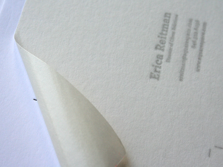 So why is the business card tricky? It is custom duplexed stock, letterpress printed, laser die cut and edge colored. We custom duplexed Neenah Classic Crest Solar White 110lb Cover up to a 220lb thickness. Then we letterpress printed them several up on a press sheet. A larger press sheet means we can economize the laser cutting by doing more at a time. The laser cutting can leave some scorch marks, so the sheet is masked with a paper tape that peels off after the cutting is complete. Then the sheet is trimmed up into cards and edge colored in black. That 220lb thickness shows off the edge and has a nice smooth surface. The poster is on Crane Lettra 110lb Flo white, pressed in a single PMS blue.