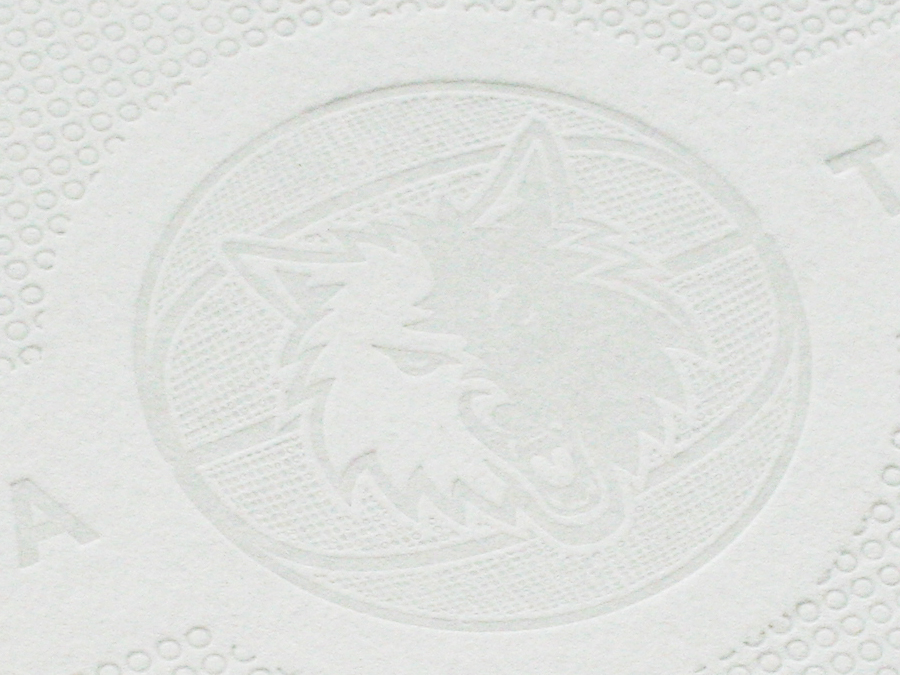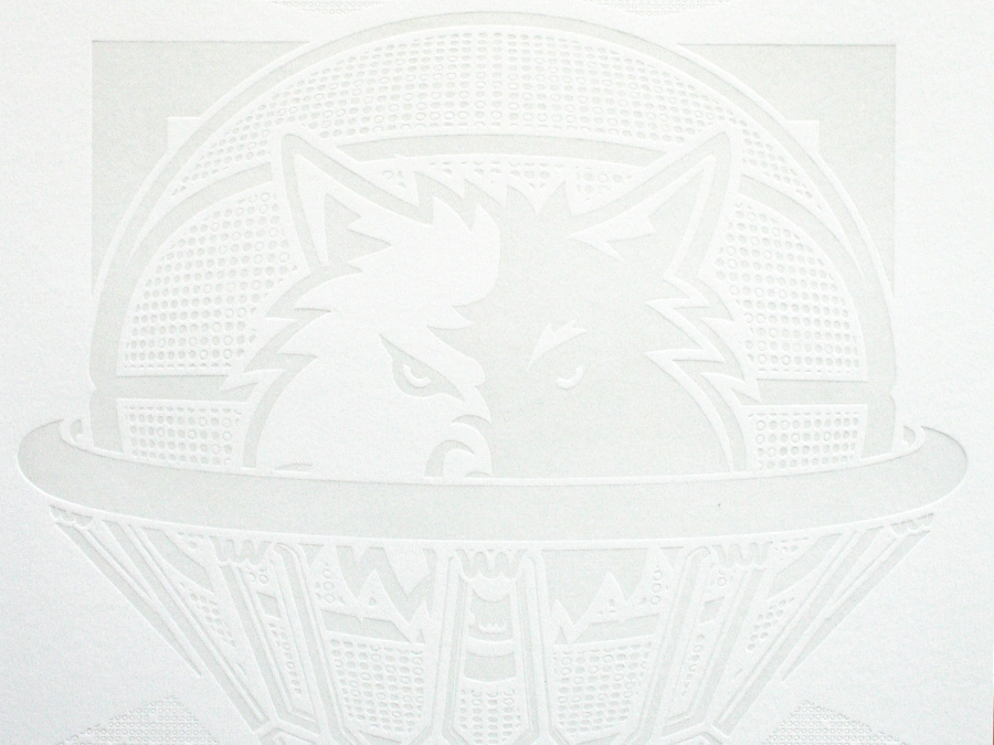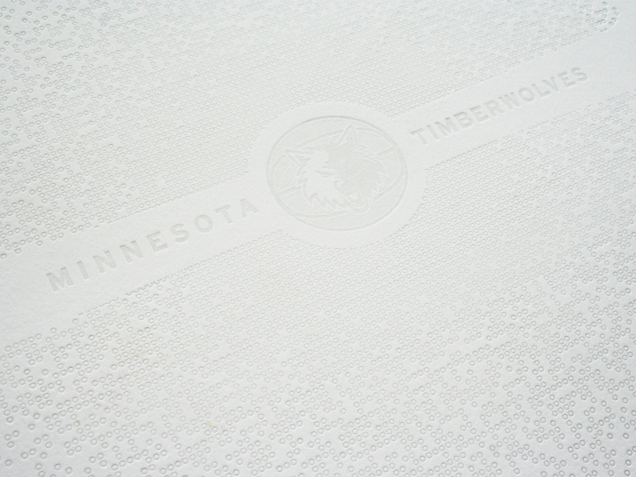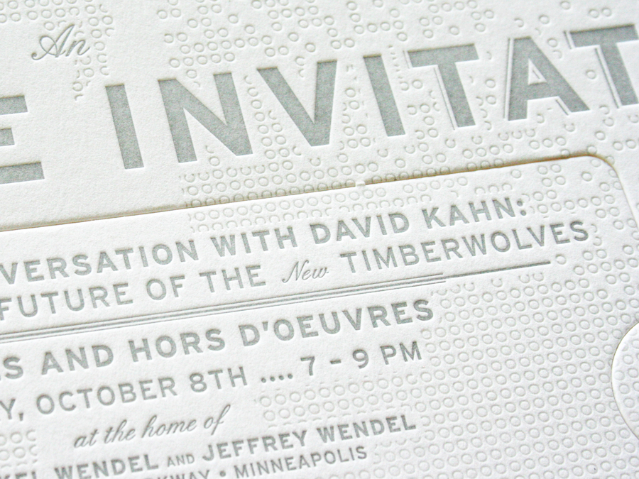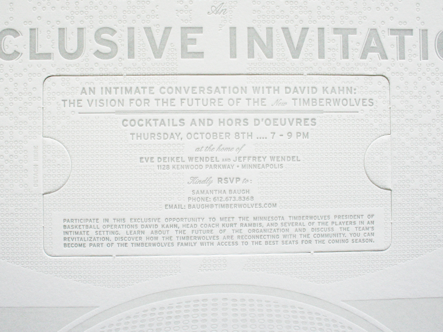 Chris at Echo Creative designed this invite for an exclusive Timberwolves event. Getting court side tickets for the season is a big deal and attracting the right people to get in on the action requires an invite with some presence. This clean and tactile card is much visually different than the usual slick and colorful NBA related material. But its overall size and thick luxury material make their own statement. And, the dimpled basketball pattern just looks great printed letterpress.